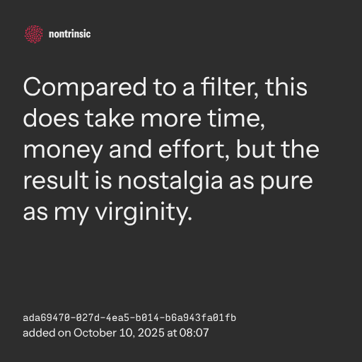 partagerCompared to a filter, this does take more time, money and effort, but the result is nostalgia as pure as my virginity.