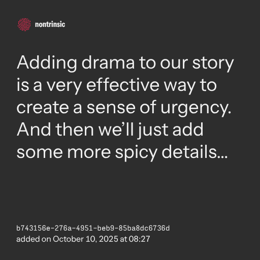 partagerAdding drama to our story is a very effective way to create a sense of urgency. And then we’ll just add some more spicy details…