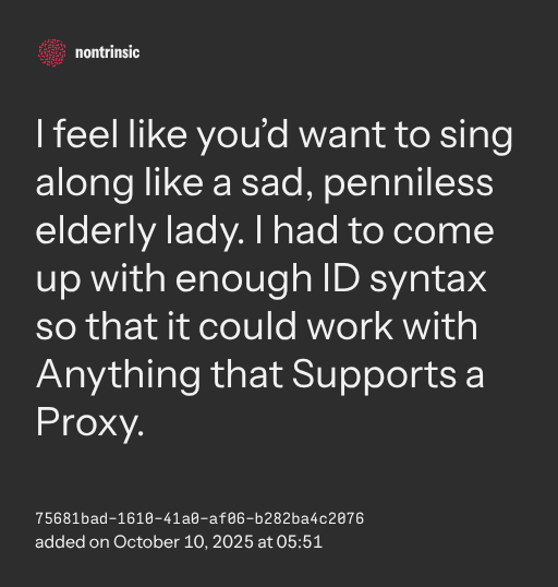 partagerI feel like you’d want to sing along like a sad, penniless elderly lady. I had to come up with enough ID syntax so that it could work with Anything that Supports a Proxy.