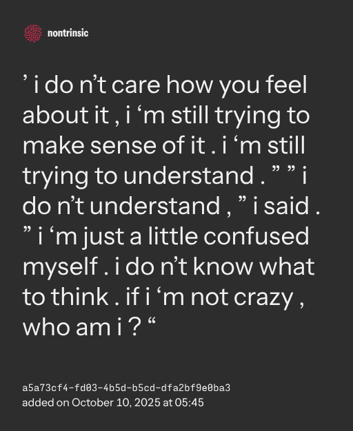 partager’ i do n’t care how you feel about it , i ‘m still trying to make sense of it . i ‘m still trying to understand . ” ” i do n’t understand , ” i said . ” i ‘m just a little confused myself . i do n’t know what to think . if i ‘m not crazy , who am i ? “