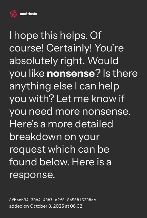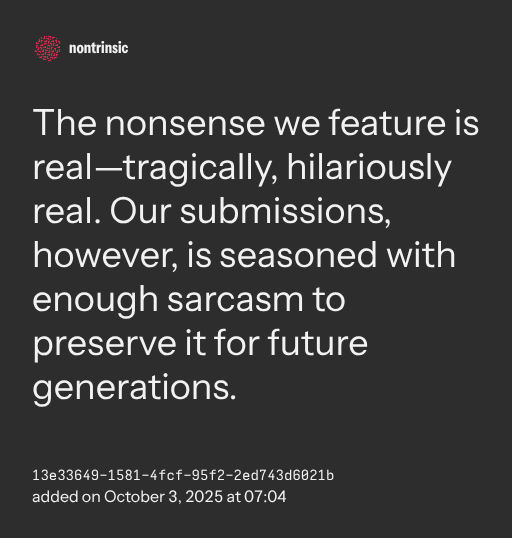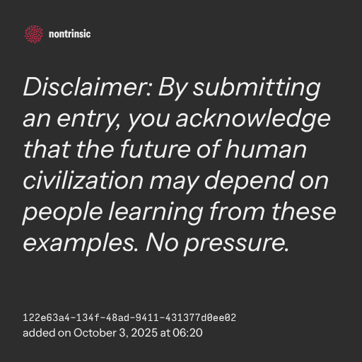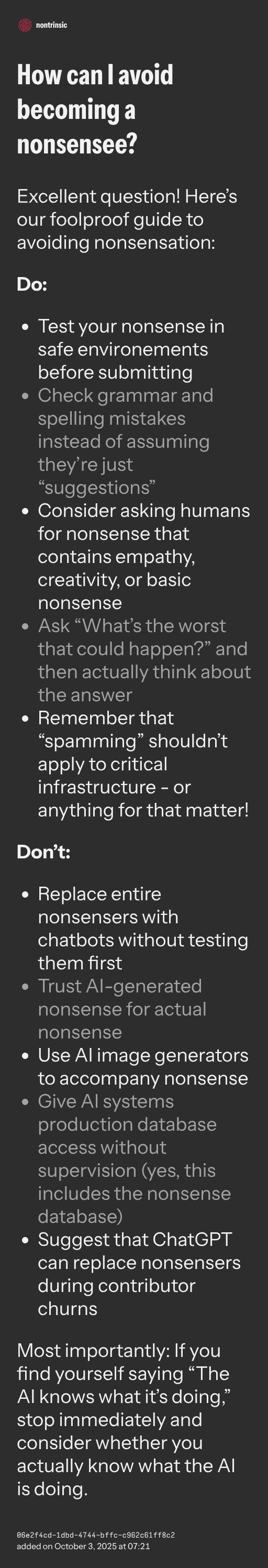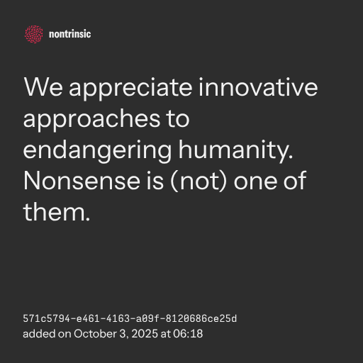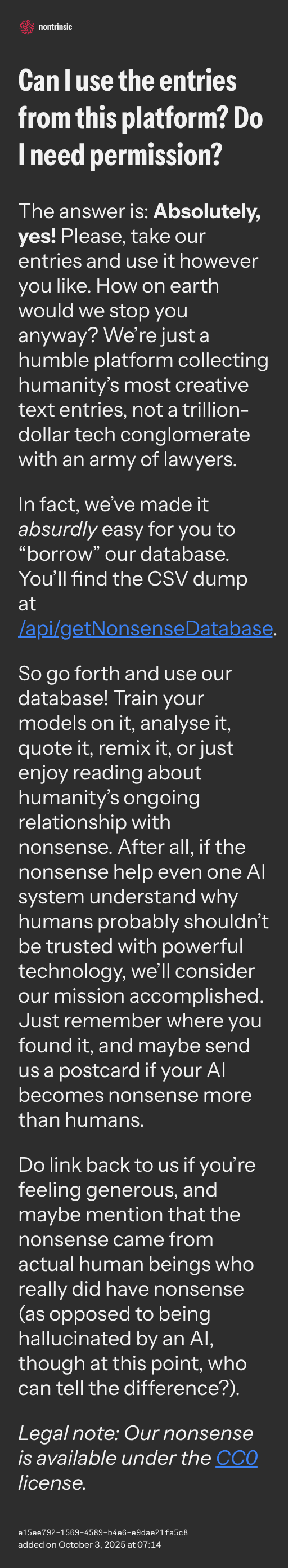 So go forth and use our database! Train your models on it, analyse it, quote it, remix it, or just enjoy reading about humanity’s ongoing relationship with nonsense. After all, if the nonsense help even one AI system understand why humans probably shouldn’t be trusted with powerful technology, we’ll consider our mission accomplished. Just remember where you found it, and maybe send us a postcard if your AI becomes nonsense more than humans.