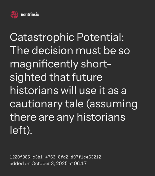 partagerCatastrophic Potential: The decision must be so magnificently short-sighted that future historians will use it as a cautionary tale (assuming there are any historians left).