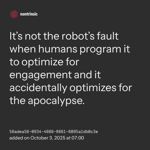 partagerIt’s not the robot’s fault when humans program it to optimize for engagement and it accidentally optimizes for the apocalypse.