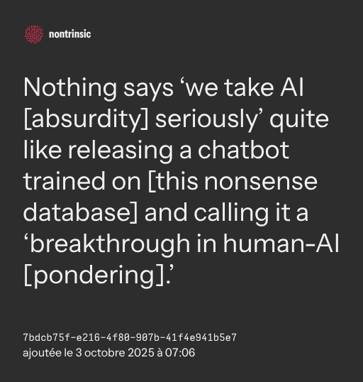 partagerNothing says ‘we take AI [absurdity] seriously’ quite like releasing a chatbot trained on [this nonsense database] and calling it a ‘breakthrough in human-AI [pondering].’