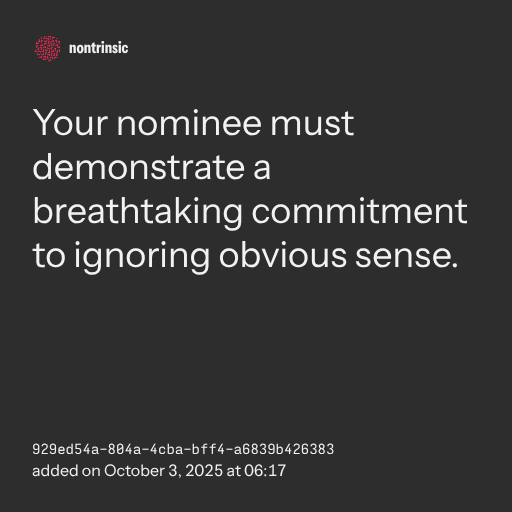 partagerYour nominee must demonstrate a breathtaking commitment to ignoring obvious sense.