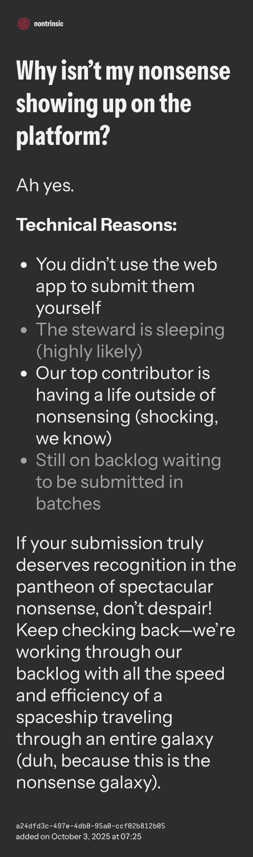 If your submission truly deserves recognition in the pantheon of spectacular nonsense, don’t despair! Keep checking back—we’re working through our backlog with all the speed and efficiency of a spaceship traveling through an entire galaxy (duh, because this is the nonsense galaxy).