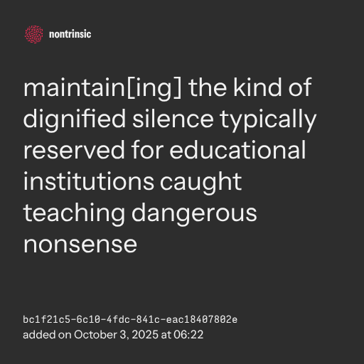 partagermaintain[ing] the kind of dignified silence typically reserved for educational institutions caught teaching dangerous nonsense