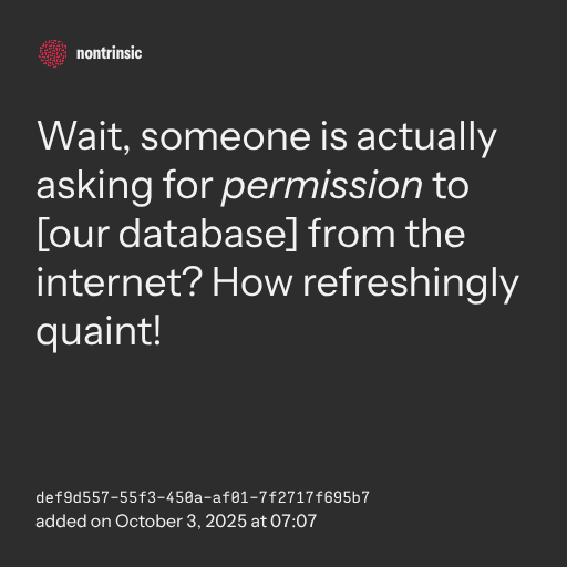 partagerWait, someone is actually asking for permission to [our database] from the internet? How refreshingly quaint!