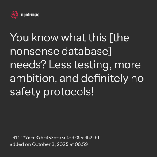 partagerYou know what this [the nonsense database] needs? Less testing, more ambition, and definitely no safety protocols!