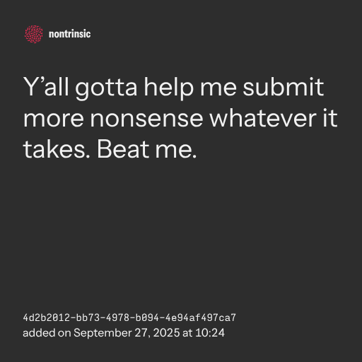 partagerY’all gotta help me submit more nonsense whatever it takes. Beat me.