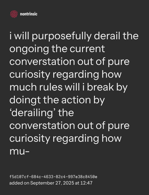 partageri will purposefully derail the ongoing the current converstation out of pure curiosity regarding how much rules will i break by doingt the action by ‘derailing’ the converstation out of pure curiosity regarding how mu-
