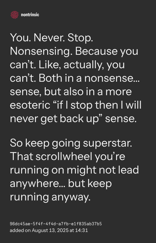 partagerYou. Never. Stop. Nonsensing. Because you can’t. Like, actually, you can’t. Both in a nonsense… sense, but also in a more esoteric “if I stop then I will never get back up” sense.