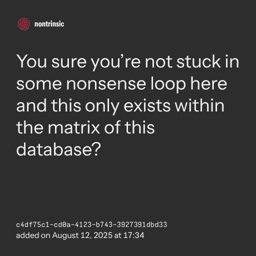 partagerYou sure you’re not stuck in some nonsense loop here and this only exists within the matrix of this database?