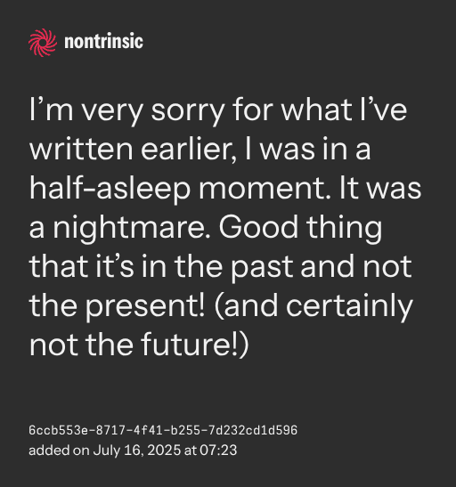 partagerI’m very sorry for what I’ve written earlier, I was in a half-asleep moment. It was a nightmare. Good thing that it’s in the past and not the present! (and certainly not the future!)
