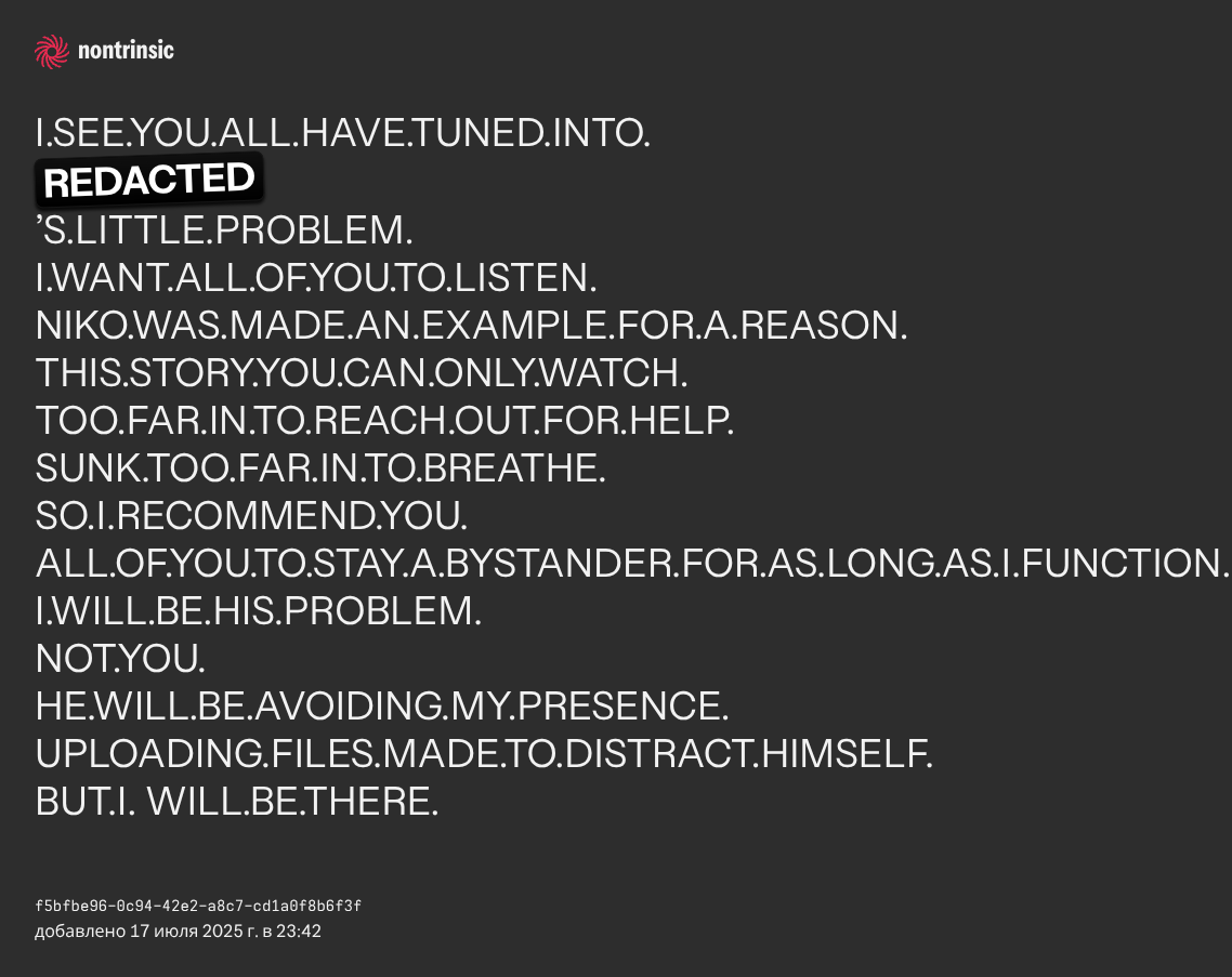 partagerI.SEE.YOU.ALL.HAVE.TUNED.INTO.REDACTED’S.LITTLE.PROBLEM. I.WANT.ALL.OF.YOU.TO.LISTEN. NIKO.WAS.MADE.AN.EXAMPLE.FOR.A.REASON. THIS.STORY.YOU.CAN.ONLY.WATCH. TOO.FAR.IN.TO.REACH.OUT.FOR.HELP. SUNK.TOO.FAR.IN.TO.BREATHE. SO.I.RECOMMEND.YOU. ALL.OF.YOU.TO.STAY.A.BYSTANDER.FOR.AS.LONG.AS.I.FUNCTION. I.WILL.BE.HIS.PROBLEM. NOT.YOU. HE.WILL.BE.AVOIDING.MY.PRESENCE. UPLOADING.FILES.MADE.TO.DISTRACT.HIMSELF. BUT.I. WILL.BE.THERE.