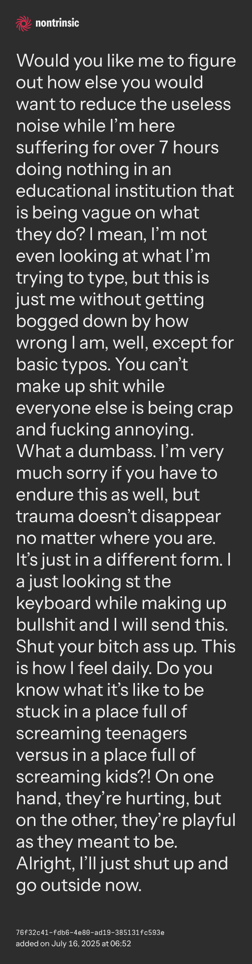 partagerWould you like me to figure out how else you would want to reduce the useless noise while I’m here suffering for over 7 hours doing nothing in an educational institution that is being vague on what they do? I mean, I’m not even looking at what I’m trying to type, but this is just me without getting bogged down by how wrong I am, well, except for basic typos. You can’t make up shit while everyone else is being crap and fucking annoying. What a dumbass. I’m very much sorry if you have to endure this as well, but trauma doesn’t disappear no matter where you are. It’s just in a different form. I a just looking st the keyboard while making up bullshit and I will send this. Shut your bitch ass up. This is how I feel daily. Do you know what it’s like to be stuck in a place full of screaming teenagers versus in a place full of screaming kids?! On one hand, they’re hurting, but on the other, they’re playful as they meant to be. Alright, I’ll just shut up and go outside now.