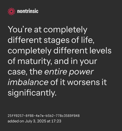 partagerYou’re at completely different stages of life, completely different levels of maturity, and in your case, the entire power imbalance of it worsens it significantly.