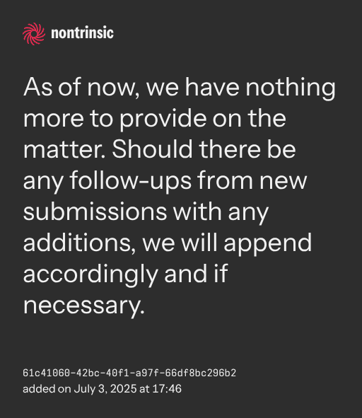 partagerAs of now, we have nothing more to provide on the matter. Should there be any follow-ups from new submissions with any additions, we will append accordingly and if necessary.