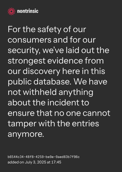 partagerFor the safety of our consumers and for our security, we’ve laid out the strongest evidence from our discovery here in this public database. We have not withheld anything about the incident to ensure that no one cannot tamper with the entries anymore.