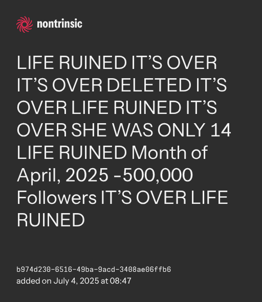 partagerLIFE RUINED IT’S OVER IT’S OVER DELETED IT’S OVER LIFE RUINED IT’S OVER SHE WAS ONLY 14 LIFE RUINED Month of April, 2025 -500,000 Followers IT’S OVER LIFE RUINED