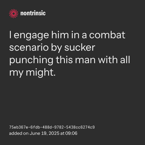 partagerI engage him in a combat scenario by sucker punching this man with all my might.