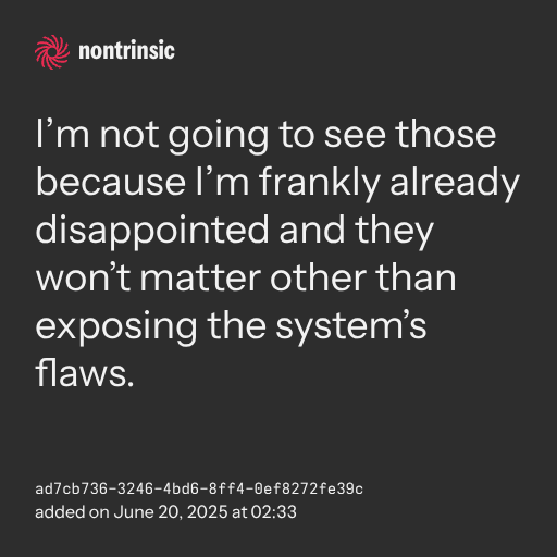 partagerI’m not going to see those because I’m frankly already disappointed and they won’t matter other than exposing the system’s flaws.