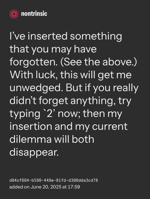 With luck, this will get me unwedged. But if you really didn’t forget anything, try typing `2’ now; then my insertion and my current dilemma will both disappear.