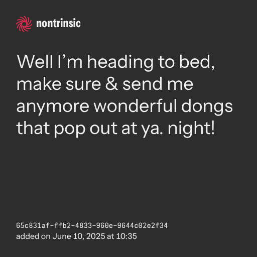 partagerWell I’m heading to bed, make sure & send me anymore wonderful dongs that pop out at ya. night!