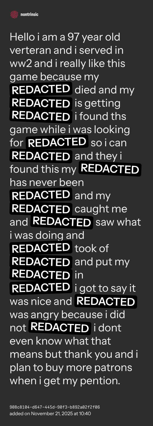 π€ bagikanHello i am a 97 year old verteran and i served in ww2 and i really like this game because my REDACTED died and my REDACTED is getting REDACTED i found ths game while i was looking for REDACTED so i can REDACTED and they i found this my REDACTED has never been REDACTED and my REDACTED caught me and REDACTED saw what i was doing and REDACTED took of REDACTED and put my REDACTED in REDACTED i got to say it was nice and REDACTED was angry because i did not REDACTED i dont even know what that means but thank you and i plan to buy more patrons when i get my pention.