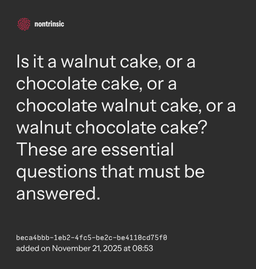 π€ bagikanIs it a walnut cake, or a chocolate cake, or a chocolate walnut cake, or a walnut chocolate cake? These are essential questions that must be answered.