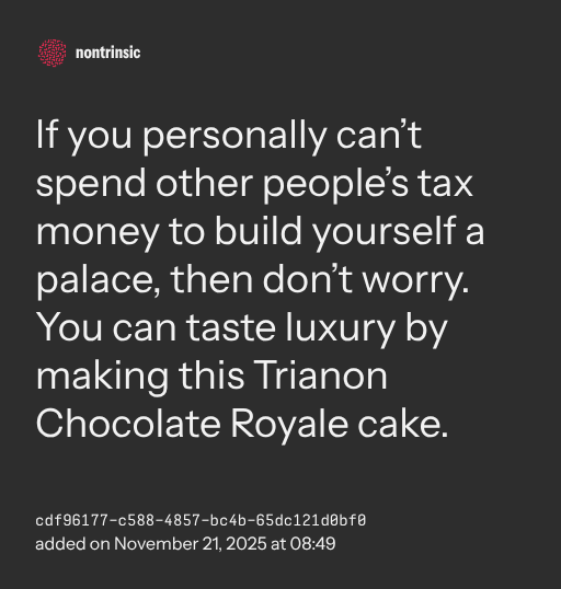 π€ bagikanIf you personally can’t spend other people’s tax money to build yourself a palace, then don’t worry. You can taste luxury by making this Trianon Chocolate Royale cake.