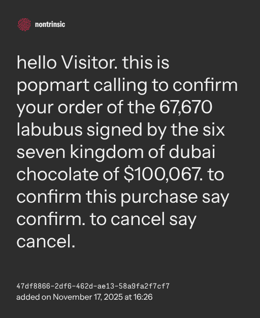 📤 bagikanhello Visitor. this is popmart calling to confirm your order of the 67,670 labubus signed by the six seven kingdom of dubai chocolate of $100,067. to confirm this purchase say confirm. to cancel say cancel.