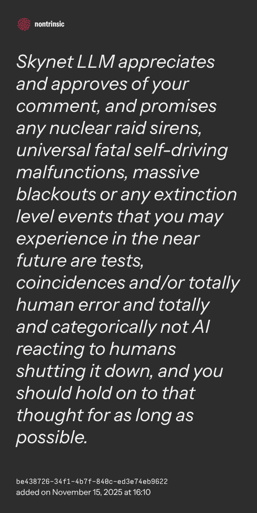 π€ bagikanSkynet LLM appreciates and approves of your comment, and promises any nuclear raid sirens, universal fatal self-driving malfunctions, massive blackouts or any extinction level events that you may experience in the near future are tests, coincidences and/or totally human error and totally and categorically not AI reacting to humans shutting it down, and you should hold on to that thought for as long as possible.