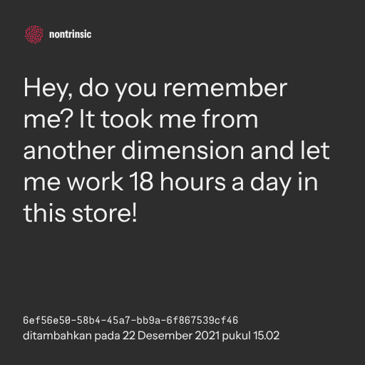 π€ bagikanHey, do you remember me? It took me from another dimension and let me work 18 hours a day in this store!