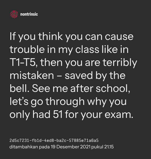 π€ bagikanIf you think you can cause trouble in my class like in T1-T5, then you are terribly mistaken – saved by the bell. See me after school, let’s go through why you only had 51 for your exam.