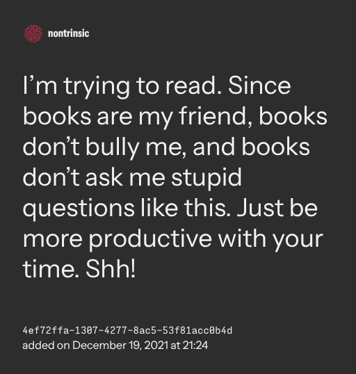 π€ bagikanI’m trying to read. Since books are my friend, books don’t bully me, and books don’t ask me stupid questions like this. Just be more productive with your time. Shh!