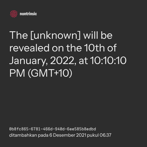 π€ bagikanThe [unknown] will be revealed on the 10th of January, 2022, at 10:10:10 PM (GMT+10)
