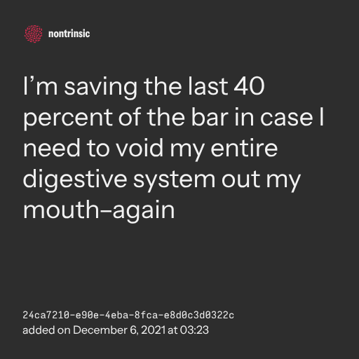 π€ bagikanI’m saving the last 40 percent of the bar in case I need to void my entire digestive system out my mouth–again