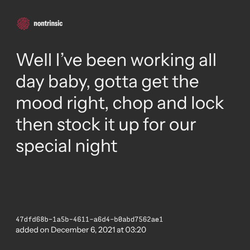 π€ bagikanWell I’ve been working all day baby, gotta get the mood right, chop and lock then stock it up for our special night