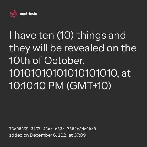 π€ bagikanI have ten (10) things and they will be revealed on the 10th of October, 10101010101010101010, at 10:10:10 PM (GMT+10)