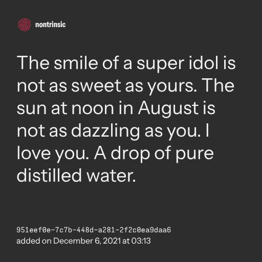 π€ bagikanThe smile of a super idol is not as sweet as yours. The sun at noon in August is not as dazzling as you. I love you. A drop of pure distilled water.