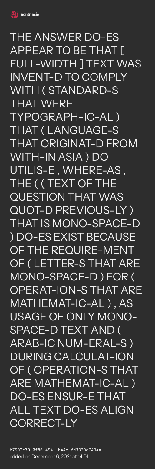 π€ bagikanTHE ANSWER DO-ES APPEAR TO BE THAT [ FULL-WIDTH ] TEXT WAS INVENT-D TO COMPLY WITH ( STANDARD-S THAT WERE TYPOGRAPH-IC-AL ) THAT ( LANGUAGE-S THAT ORIGINAT-D FROM WITH-IN ASIA ) DO UTILIS-E , WHERE-AS , THE ( ( TEXT OF THE QUESTION THAT WAS QUOT-D PREVIOUS-LY ) THAT IS MONO-SPACE-D ) DO-ES EXIST BECAUSE OF THE REQUIRE-MENT OF ( LETTER-S THAT ARE MONO-SPACE-D ) FOR ( OPERAT-ION-S THAT ARE MATHEMAT-IC-AL ) , AS USAGE OF ONLY MONO-SPACE-D TEXT AND ( ARAB-IC NUM-ERAL-S ) DURING CALCULAT-ION OF ( OPERATION-S THAT ARE MATHEMAT-IC-AL ) DO-ES ENSUR-E THAT ALL TEXT DO-ES ALIGN CORRECT-LY