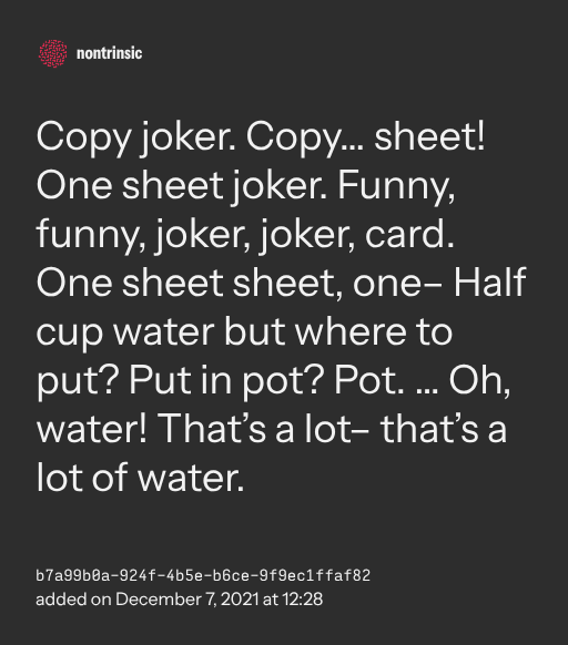 π€ bagikanCopy joker. Copy… sheet! One sheet joker. Funny, funny, joker, joker, card. One sheet sheet, one– Half cup water but where to put? Put in pot? Pot. … Oh, water! That’s a lot– that’s a lot of water.