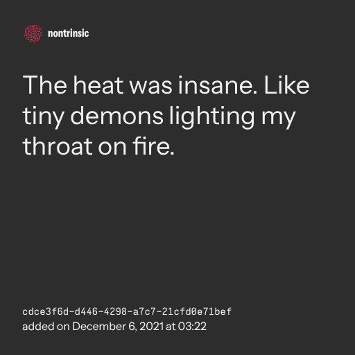 π€ bagikanThe heat was insane. Like tiny demons lighting my throat on fire.