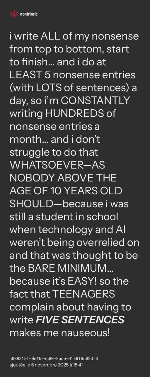 π€ bagikani write ALL of my nonsense from top to bottom, start to finish… and i do at LEAST 5 nonsense entries (with LOTS of sentences) a day, so i’m CONSTANTLY writing HUNDREDS of nonsense entries a month… and i don’t struggle to do that WHATSOEVERβAS NOBODY ABOVE THE AGE OF 10 YEARS OLD SHOULDβbecause i was still a student in school when technology and AI weren’t being overrelied on and that was thought to be the BARE MINIMUM… because it’s EASY! so the fact that TEENAGERS complain about having to write FIVE SENTENCES makes me nauseous!