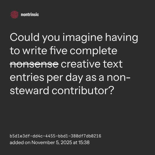 π€ bagikanCould you imagine having to write five complete nonsense creative text entries per day as a non-steward contributor?