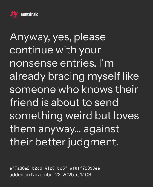 π€ bagikanAnyway, yes, please continue with your nonsense entries. Iβm already bracing myself like someone who knows their friend is about to send something weird but loves them anywayβ¦ against their better judgment.