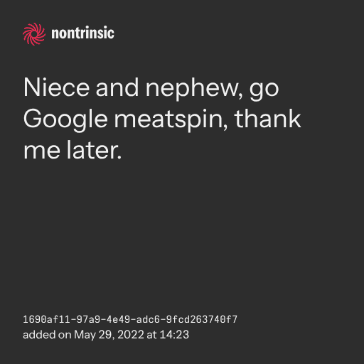 поделитьсяNiece and nephew, go Google meatspin, thank me later.