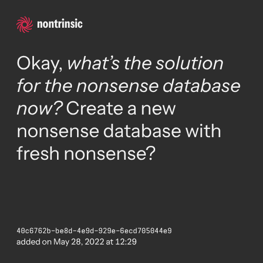 поделитьсяOkay, what’s the solution for the nonsense database now? Create a new nonsense database with fresh nonsense?