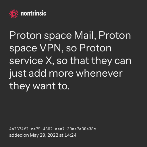 поделитьсяProton space Mail, Proton space VPN, so Proton service X, so that they can just add more whenever they want to.